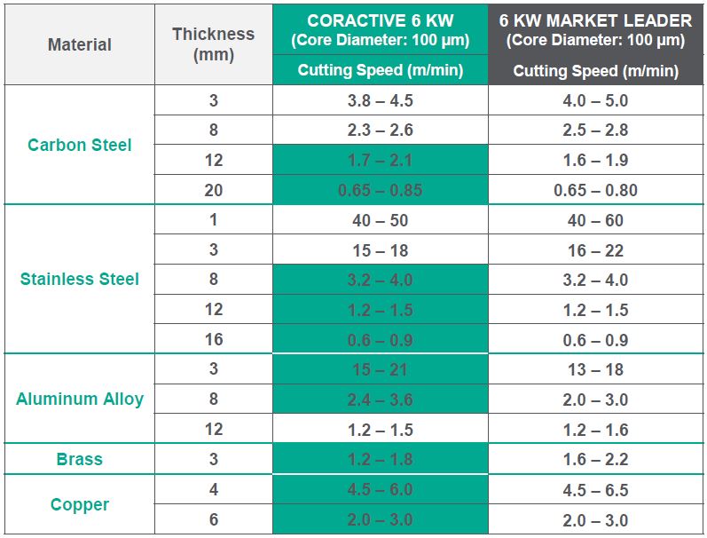 In comparison with the 6 kilowatt industry standard, Coractive CW fiber laser: