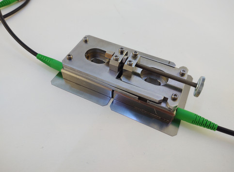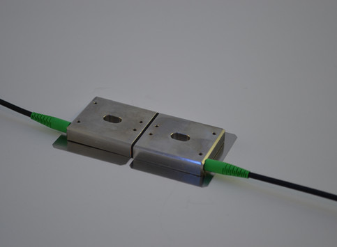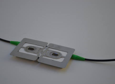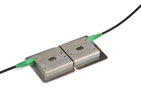 Küçük boyutlu fiber Bragg Izgara tabanlı gerinim sensörü. Sensör bir yüzeye yapıştırılabilir veya nokta kaynak yapılabilir.